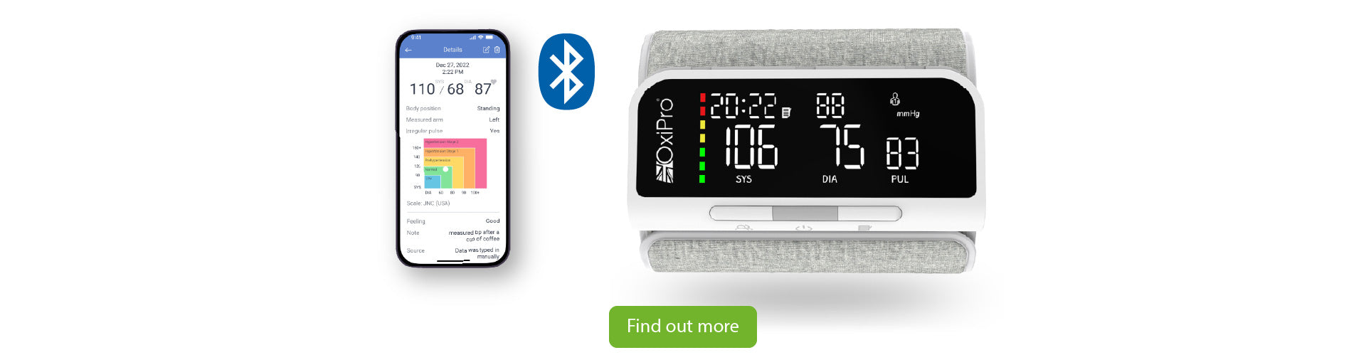 The OxiPro BP2 is an all-in-one smart blood pressure monitor with a smartphone app, allowing you to easily share your BP results with your hypertension clinic.